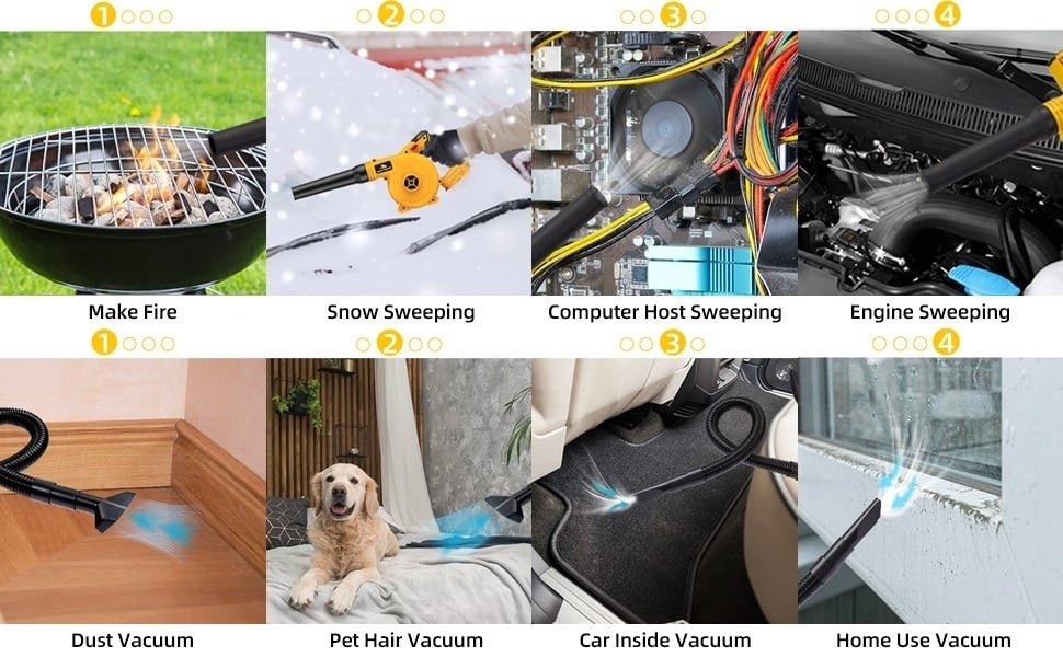 Souffleur et aspirateur 2 en 1 : le design 2 en 1 permet de commuter le souffleur et l'aspirateur électriques à volonté, profitez simplement de la flexibilité et de la polyvalence de ce souffleur de feuilles portable. Ce n'est pas seulement un balayeur de feuilles, mais aussi un nettoyeur multifonctionnel de poussière et de poils d'animaux, un souffleur de voiture, un gonfleur pour le camping, le bateau ou le flottement, également génial pour évacuer tout l'air.
