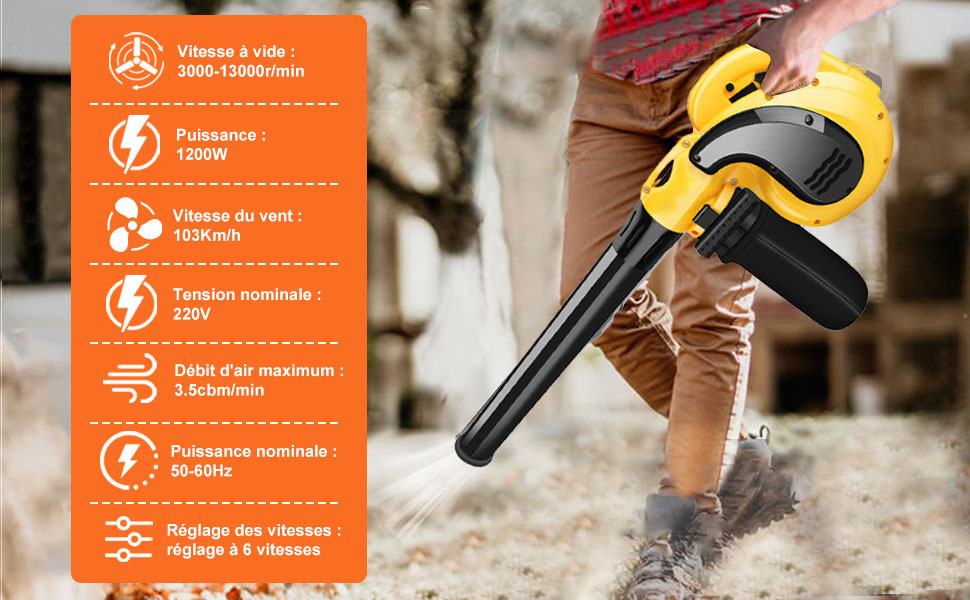 6 vitesses réglables : le souffleur de feuilles sans fil peut vous fournir 6 vitesses réglables, jusqu'à 103km/h et jusqu'à 40 km/h, ce qui peut vous aider à passer facilement du travail extérieur au travail intérieur pour tous les scénarios.